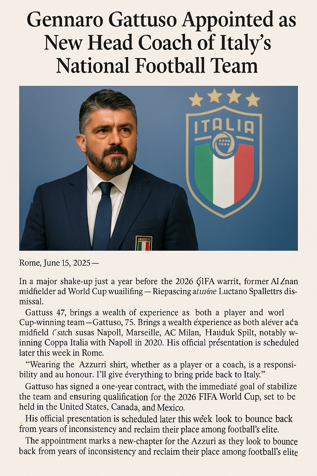 Rome, June 15, 2025 — In a major shake-up just a year before the 2026 FIFA World Cup, former AC Milan midfielder and World Cup winner Gennaro Gattuso has officially been named the new head coach of Italy’s national football team, replacing Luciano Spalletti.